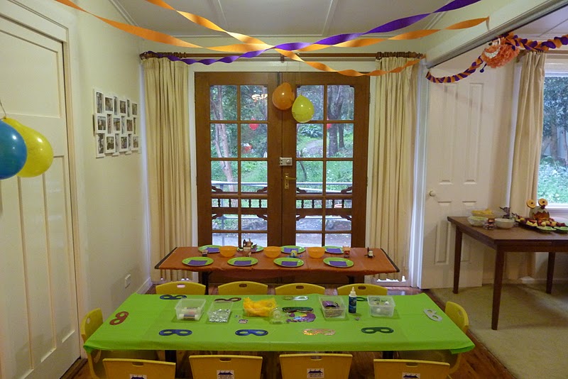 For the decorations we chose bright colours and put crepe streamers up around the house. Then we made tissue paper pom pom monsters.